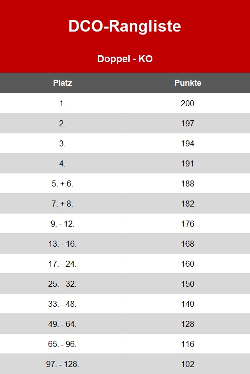 Für die Rangliste zählen die jeweils drei besten Ergebnisse – sowohl im Einzel als auch im Doppel.