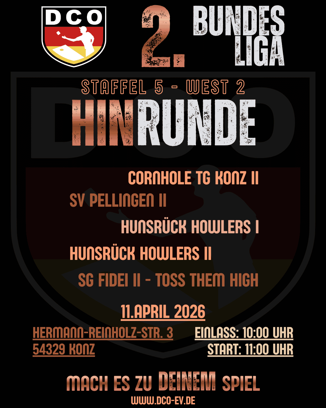 << All Events 2. BL: Staffel 5 – Hinrunde – West 2 11 April 2026 Einlass: 10:00 Uhr Start: 11:00 Uhr Share This Event 5178608 DD DAYS HH HOURS MM MIN SS SEC Details Datum: 11. April Veranstaltungskategorien: 2. Bundesliga, Bundesliga, Save The Date Veranstaltungsort konz Hermann-Reinholz-Straße 3 Konz, 54329 Germany Google Karte anzeigen + Google Kalender+ iCal Export Related Events 2. BL: Staffel 2 – Hinrunde – NORDWEST 8. März 1. BL: Staffel 5- Hinrunde – SÜDOST 14. März 2. BL: Staffel 6 – Hinrunde – WEST 3 14. März « Sachsen Open 2026 ACL Slovakia Open 2026 »